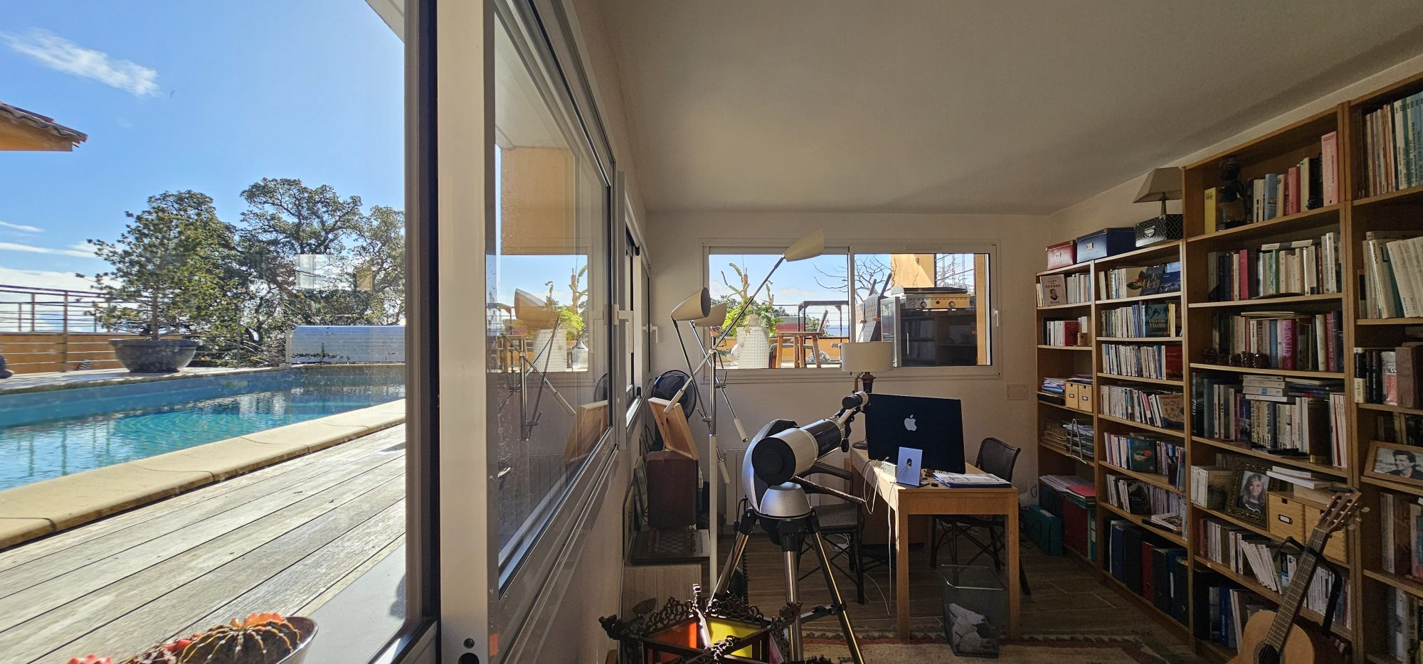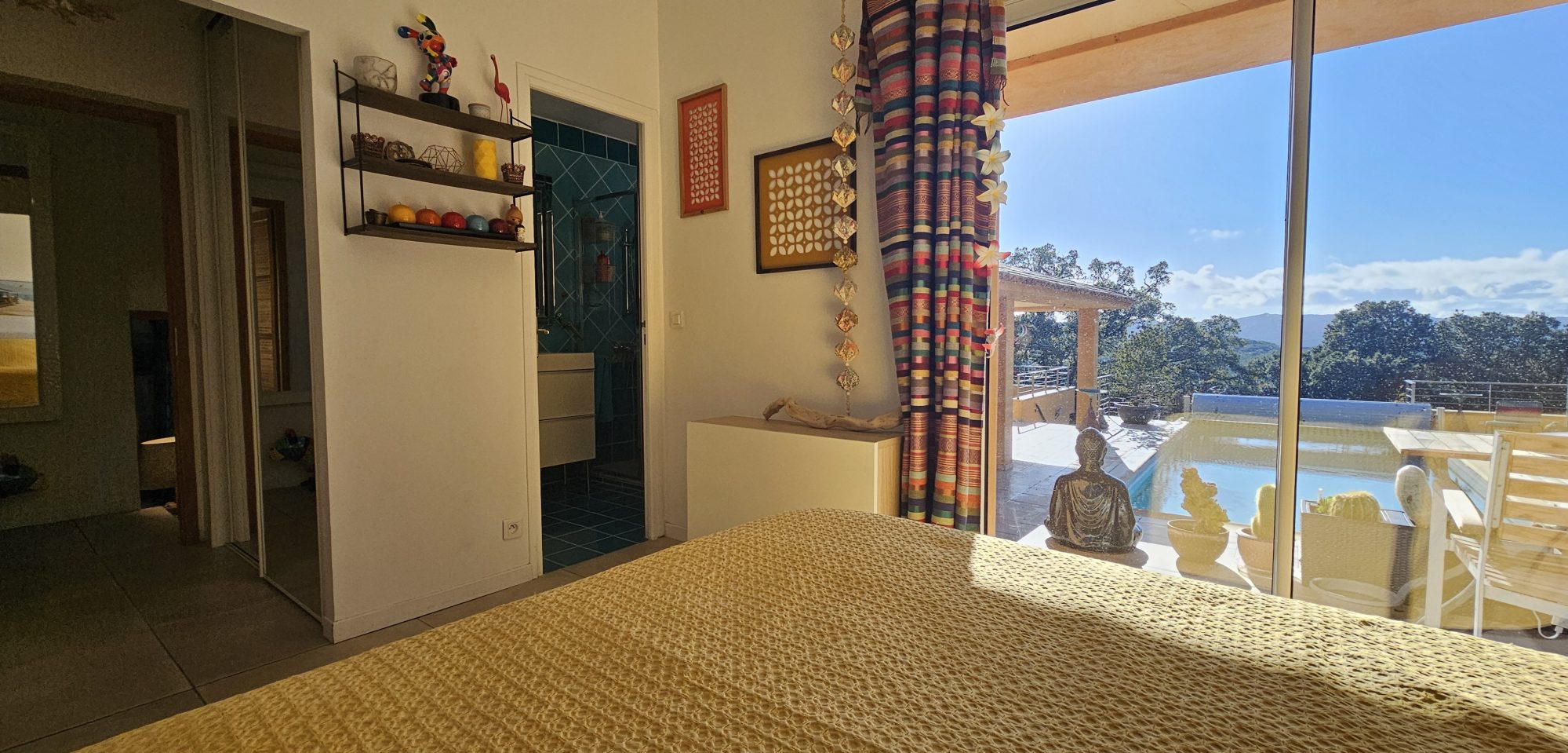 À l’étage, une chambre parentale avec salle d’eau et WC apporte un espace nuit supplémentaire, préservé et confortable. À proximité de la piscine, un bureau indépendant permet de travailler au calme.